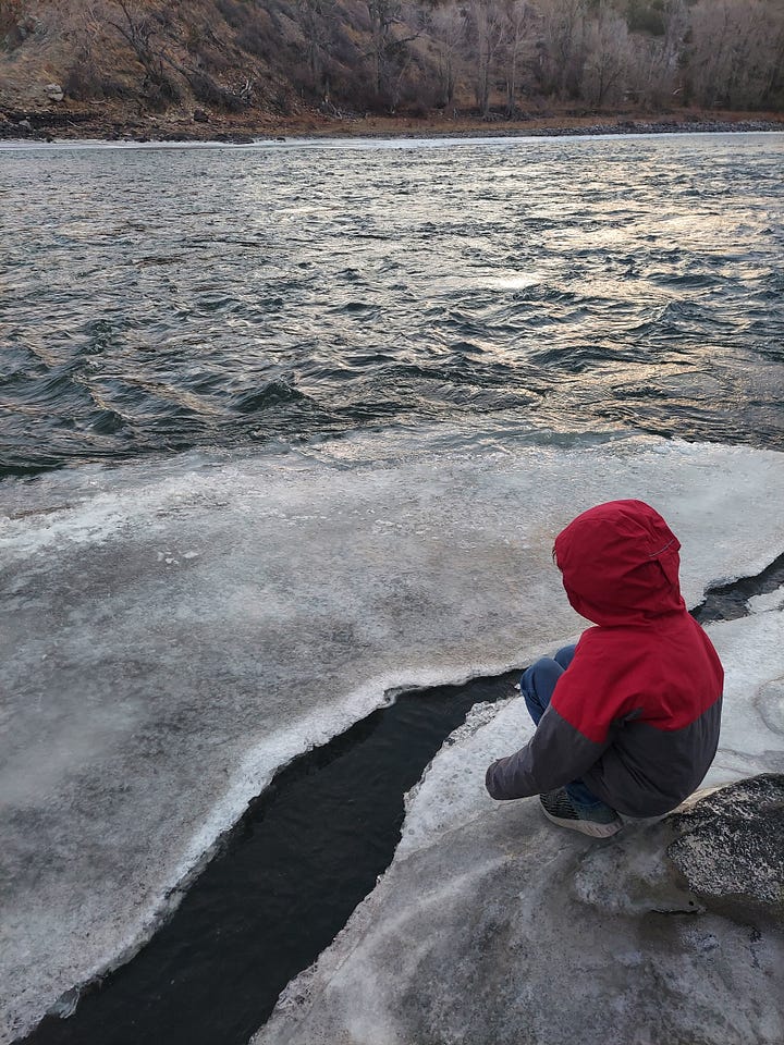 In the last decade, as I’ve continued on my Oregon-trail like journey across the West, up from the Western slope of Colorado to mythical Montana, become a mother and sunk tendrils into the soil of a new home, I have also returned to my twin writing obsessions: nature and horror. In life, as well, these two things preoccupy my mind. If I’m not watching scary movies, or writing or reading scary stories, I’m ruminating on the real-life horrors- the mental and spiritual carnage of trying to survive and raise a child in modern day Amerikkka. When I’m debilitated by depression or anxiety, I find a sunny spot to mediate, or take a walk in the cold, noting the small details of my ever-changing habitat. The past few weeks, my family and I have been spending as much time with the Yellowstone River as possible. Before school, my son and I explored the rim of ice along the riverbank, watched the currents chatter over the rocks, hunks of ice from upstream floating by. We hit at the ice with sticks to hear the thin layers crack delicately, like wine glasses shattering. Mountains in the distance, carved by glaciers, evidence of upheaval and permanence all at once.